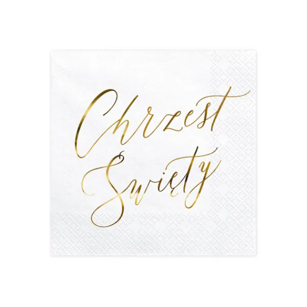 Papirservietter (20 stk.), hvide med guldmetallisk indskrift “Hellige dåb”, mål udfoldet ca. 33 x 33 cm, mål foldet ca. 16,5 x 16,5 cm.
