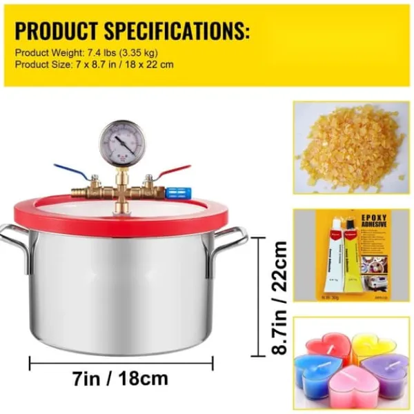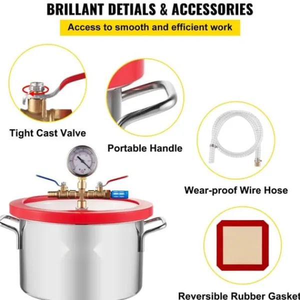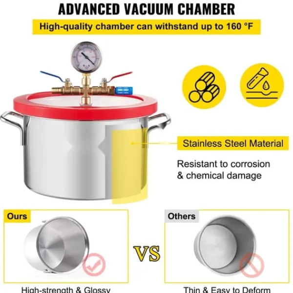 Overlegen materiale: Kapacitet: 5,7 liter. Vakuumkammerens konstruktion er lavet af holdbart rustfrit stål, som sikrer god ydeevne, mens den modstår slid, korrosion og kemiske skader, hvilket effektivt kan forlænge vakuumkammerens levetid.