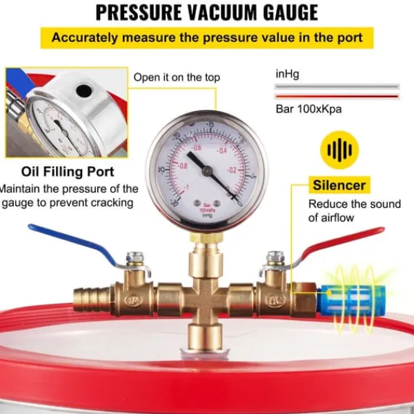 Lyddæmpere til støjreduktion: Vakuumkammeret leveres med to lyddæmpere, som reducerer vibrationer og støj, hvilket muliggør en mere stille drift. De holdbare messingforbindelser passer til de fleste vakuumpumpeforbindelser.
