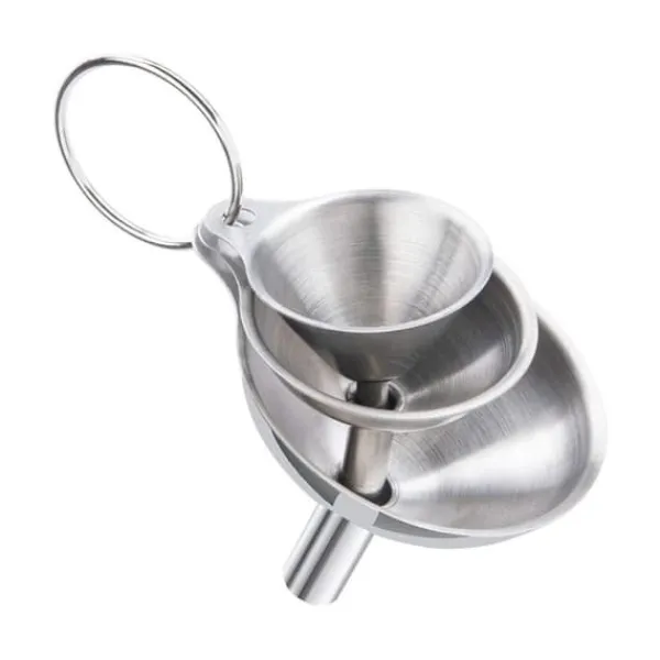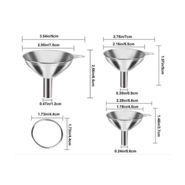 Køkkentragtsæt: Inkluderer et 3-delt sæt med store, mellemstore og små tragte og 1 metalring. Stor tragtstørrelse: Munding: 7,5 cm Stilkdiameter: 1,2 cm Højde: 6,55 cm, Mellem tragtstørrelse: Munding: 5,5 cm Stilkdiameter: 0,9 cm, Højde: 5 cm Lille tragtstørrelse: Munding: 4,5 cm, Stilkdiameter: 0,6 cm, Højde: 3,7 cm