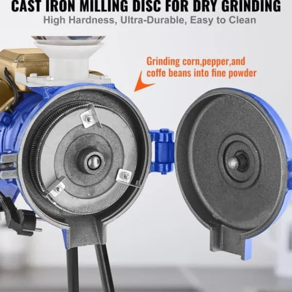 Mophorn Electric Grain Mill Grinder er en fremragende mulighed for tørslibning med højkvalitets støbejernsslibeplader, der er stærke, holdbare og nemme at rengøre. Med en kraftfuld motor og praktisk tragtformet fodringsdesign, garanterer denne mølle jævn fodring og kontinuerlig drift.