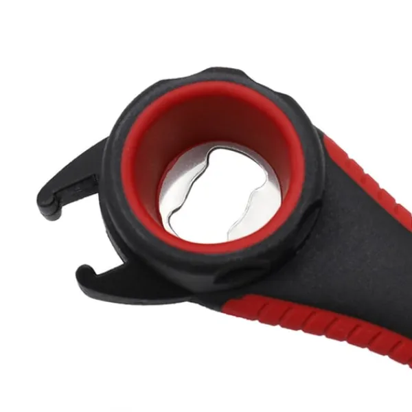 Alsidig Funktionalitet: Denne multifunktionsåbner kombinerer fem væsentlige funktioner: flaskeåbner, dåseåbner, sodavandsåbner, rejeskræller og glasåbner, der imødekommer alle dine køkken- og udendørsbehov.