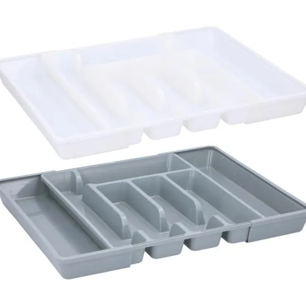 Praktisk udtrækkelig bestikbakke. Bestikbakken har 5 rum, når den er trukket ind, og 7, når den er trukket ud. Det betyder, at den passer i mange skuffer. Fås i hvid eller grå. Du kan ikke vælge, men du modtager en tilfældig farve.