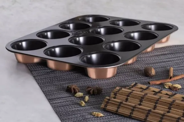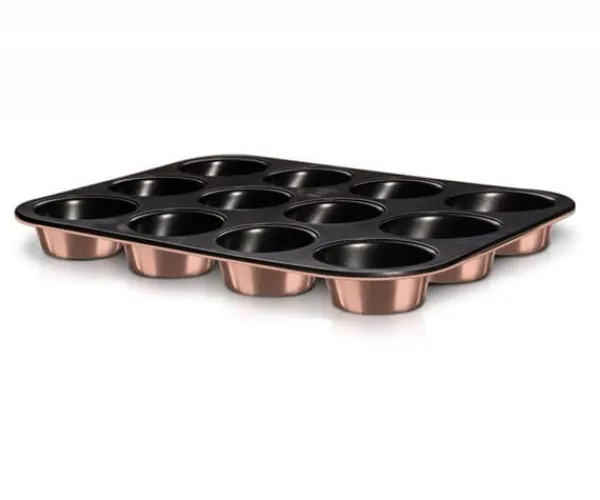 Rektangulær bageform til 12 muffins 35 x 26,5 x 3 cm fra BERLINGR HAUS, Rose Gold kollektion. Materiale: KulstofstålNon-stick belægning Farve: Guld/Sort Egenskaber: Elegant design Stilfuldt og funktionelt Non-stick belægning Let at rengøre Tåler opvaskemaskine RidsefastKan sikkert bruges i ovnen +220 grader Celsius CEco Friendly – indeholder ikke PFOA forbindelser, bly, cadmium