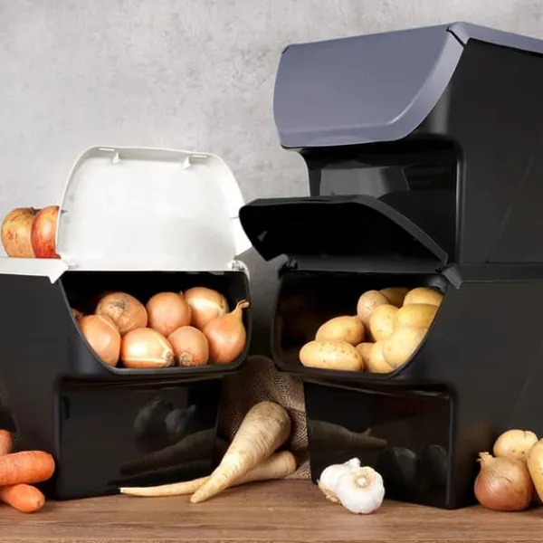 Frugt- og grøntsagsbeholder. Den kan også bruges til sortering af affald eller opbevaring af ting derhjemme eller i garagen. Stilfuldt farvet, let og nem at bruge. Det aftagelige låg har en hængslet klap, der gør den nem at genopfylde og rengøre.