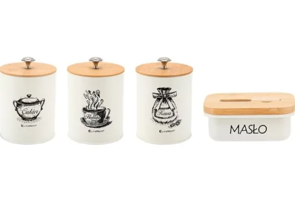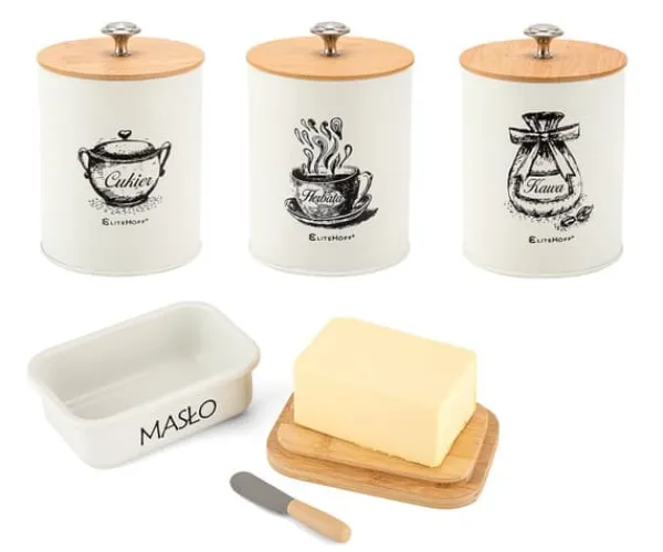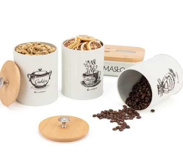 Sæt med 3 køkkenbeholdere med smørfad Et praktisk og funktionelt sæt køkkenbeholdere er den perfekte løsning til ethvert hjem. Sættet består af tre beholdere til kaffe, te og sukker med mål på Ø11 x 16 cm, og et smørfad med mål på 15,5 x 10,5 x 6,5 cm Funktionalitet på højeste niveau er designet til at opfylde alle behov i dit køkken. De er modstandsdygtige over for mekaniske skader og lette at holde rene Fremstillet af hvidt pulverlakeret metal. Låg af bambustræ. Smørfadets låg indeholder en smørkniv placeret i en profileret fordybning. Elegant design Sættet med køkkenbeholdere er ikke kun praktisk, men ser også meget elegant ud. Derudover har hver beholder en tæt lukning, som sikrer langsigtet vedligeholdelse af produktets friskhed. Specifikation: Højkvalitets sæt metalbeholdere, pulverlakeret. Egenskaber: – Lavet af hygiejniske og økologiske materialer – Holdbar og solid konstruktion – Beholderne kan bruges til at opbevare kaffe, løse og teposer, sukker og andre tørre produkter – Beholderne skal vaskes i hånden og tørres umiddelbart efter vask – Størrelse på beholderne: Ø11 x 16 cm – Størrelse på smørfadet: 15,5 cm x 1 cm – 15,5 cm x 1 cm.