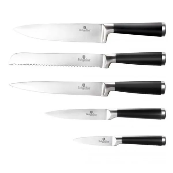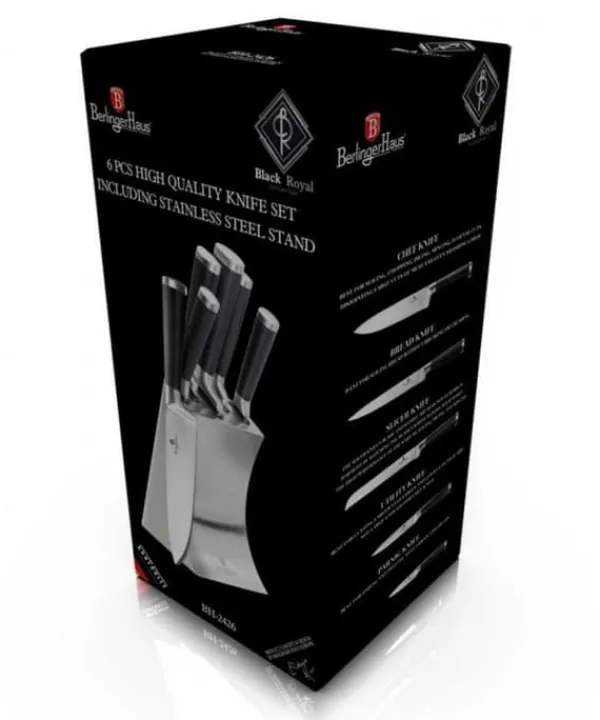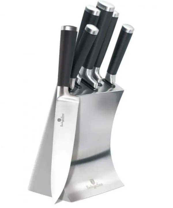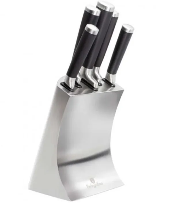 Et sæt 6-elements knive på stativ fra BERLINGER HAUS fra Black Royal Line-serien Designet til portionering af kød og fisk, skæring af brød og skrælning og hakning af grøntsager. Knive i rustfrit stål. Udstyret med håndtag dækket med et meget slidstærkt tyndt lag silikone for et fast greb under alle forhold. Egenskaber: Materiale: rustfrit stål Perfekt til hverdagsbrug, rustfrit stålblade giver styrke og holdbarhed. Gem ikke madlugte, Ergonomisk SOFT TOUCH håndtag for komfort under skæring. Eco Friendly – indeholder ikke PFOA, bly eller cadmium Sættet indeholder: 1 x 20 cm kokkekniv 1 x 20 cm brødkniv 1 x 20 cm filetkniv 1 x 12,5 cm universalkniv 1 x 9 cm skrællekniv grøntsager 1 x rustfri. stålblok – dimensioner refererer til bladets længde