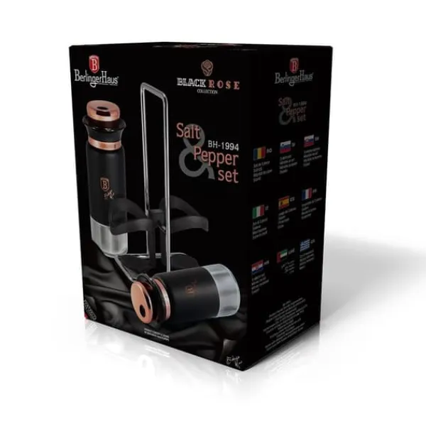 SALT- OG PEBERSÆT 3 stk BERLINGER HAUS BLACK ROSE BH-1994 KRIDDSÆT Sættet indeholder 2 beholdere med en kapacitet på 120 ml og et stativ. Beholdere lavet af rustfrit stål kombineret med glas. Bunden af beholderne er gennemsigtig, hvilket gør det nemmere at identificere krydderier. Sættet ser meget imponerende ud på bordet. Dens udseende vil matche tallerknerne og køkkentilbehøret fra BLACK ROSE-kollektionen. Sættet er pakket i en farverig æske. Kapacitet på 1 beholder: 120ml