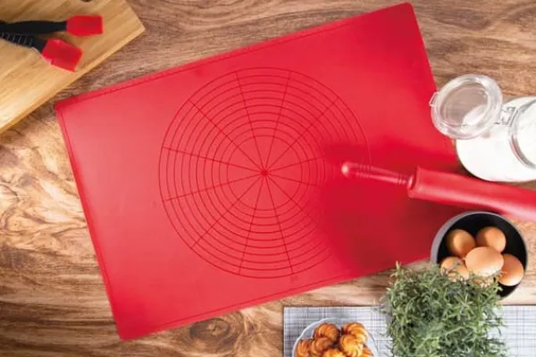 Højkvalitets silikonemåtte/bord til æltning af dej. Et produkt fra Berlinger Haus fra Burgundy Collection Silicone er et materiale, der er modstandsdygtigt over for temperaturer fra -40 til +240 grader Celsius. Den æltede dej klistrer eller klistrer ikke til overfladen. Måtterne kan rulles sammen og vaskes i opvaskemaskine. De er ekstremt fleksible og holdbare. Tilgængelig farve: rød Produktegenskaber: – lavet af sikker, giftfri silikone – klæber ikke – mål: 62 x 42 cm – dejdiameter måleområde: 12-40 cm – kan rulles og rulles. – efter rulning tager den meget lang tid lidt plads – absorberer ikke lugt eller væske – er nem at holde ren – Kan også bruges som underlag til varme retter eller måtte anti-skrid
