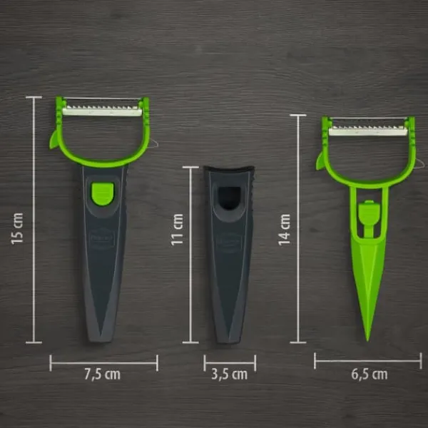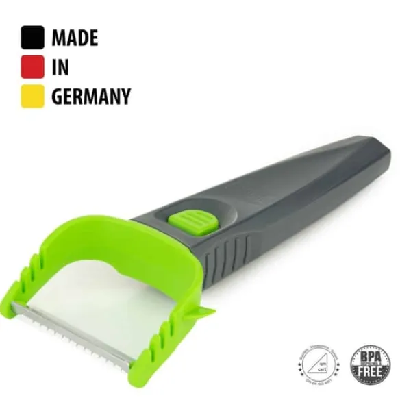 let. hurtig. sund og rask. Dette er principperne for Boerner. Vi ønsker at give dig de rigtige værktøjer til at fremme sund kost. For eksempel vores nye køkkenhjælpere. Vi har udviklet et håndtag, der giver dig mulighed for at bruge forskellige beslag ‘ alt efter hvad du har brug for. Dette sæt består af højkvalitetshåndtaget, som er velegnet til højre- og venstrehåndede, og to tilbehør. På den ene side er der tale om en grøntsagsskræller med et savtakket blad af høj kvalitet, og på den anden side indeholder sættet med 3 også et julienne-tilbehør, der hurtigt laver lækre grøntsagsnudler. Så du kan skrælle kartofler eller skære lækre julienne strimler. Derudover er Schaeler særdeles praktisk på grund af sin handy og lille form. Så den kan nemt gemmes væk og får plads selv i det mindste køkken. Vi ønsker, at du skal være overbevist om vores produkter, derfor leverer vi kun den bedste kvalitet – håndtaget er lavet af højkvalitets plastik og skrællernes blade er lavet af pålideligt rustfrit stål. Skrællerne er multifunktionelle – skræl, pynt og pynt med kun én enhed.