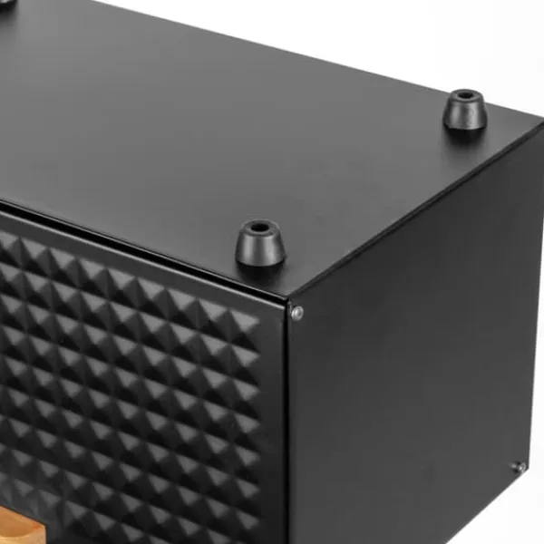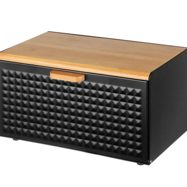 Brødkasse i stål med bambusbræt Åbning af både top- og frontdæksel giver nem adgang til brødet. Krop lavet af sortlakeret rustfrit stål. Topdæksel lavet af bambustræ. Designet til opbevaring af alle typer brød. Attraktivt, moderne design. Lavet af økologiske materialer. Farve: sort/lys træ. Brødkassemål: 33,5 x 23,5 x 21cm Emballage: farverigt pap.