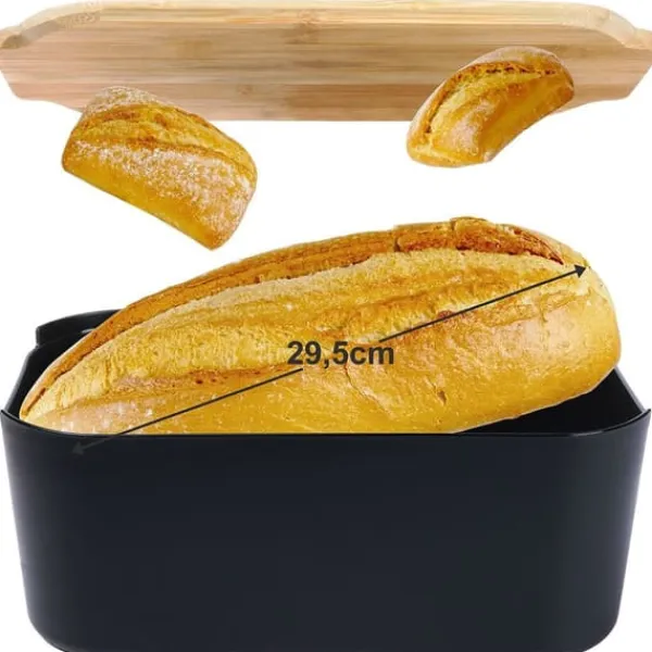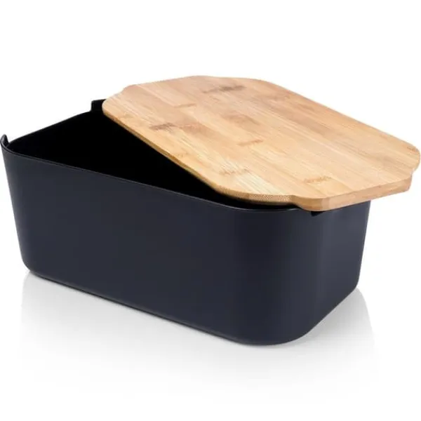 STILFULD – Brødkasse lavet af sort plastik af høj kvalitet med et bambusbræt. Brødkassen har udvendige mål: 33 x 18,5 x 12 cm.