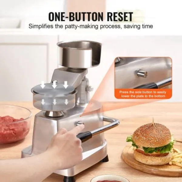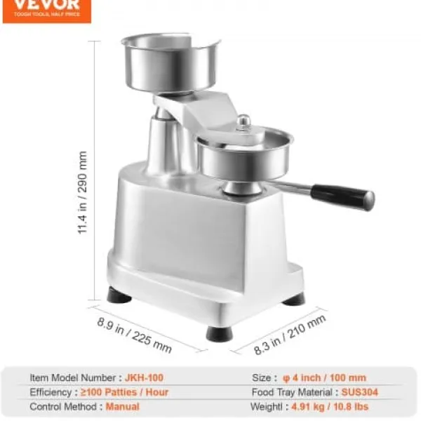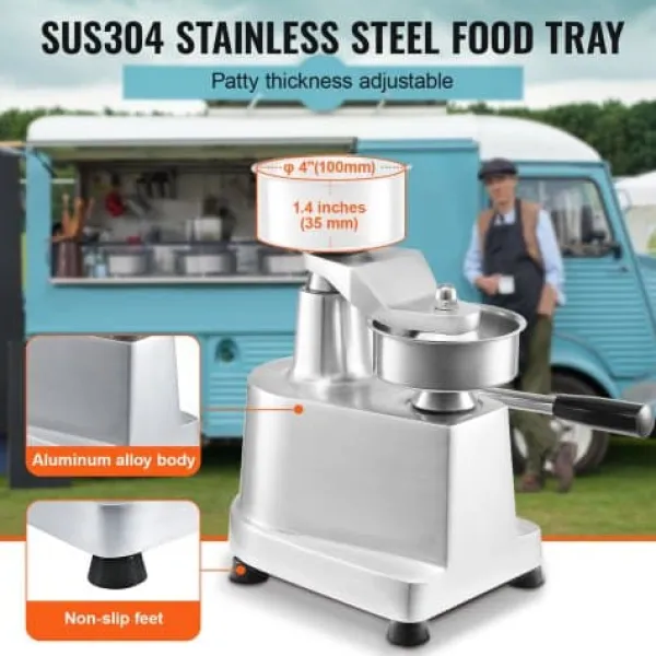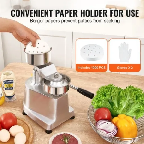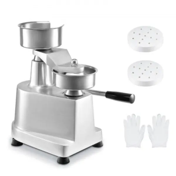 Denne kommercielle burgerpresse er designet til at effektivisere dit køkkenarbejde ved hurtigt at forme ensartede bøffer med minimal indsats. Den robuste konstruktion i fødevaregodkendt rustfrit stål sikrer holdbarhed og nem rengøring, mens det brugervenlige design gør den velegnet til forskellige fødevaremiljøer. Med medfølgende papirark og handsker er den ideel til travle køkkener, burgerbarer og udendørs arrangementer.
