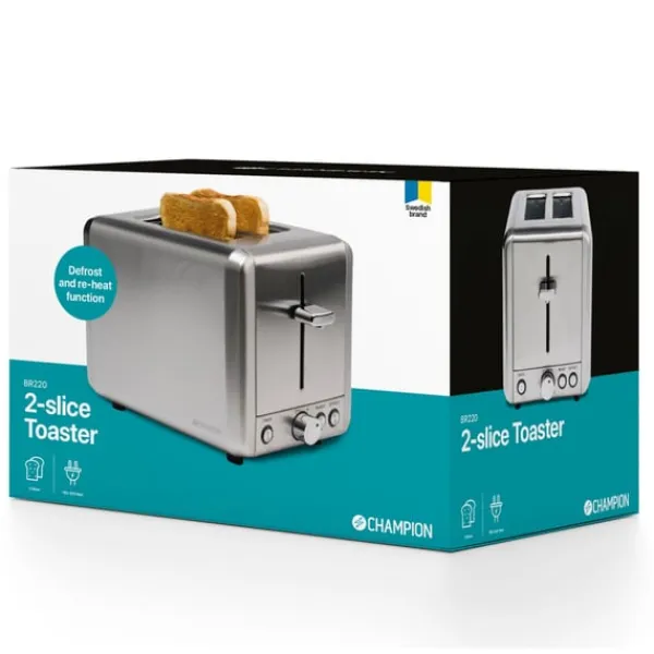 Champions brödrost ger gyllene rostat bröd för familjens lugna morgonstunder. Med 6 ställbara värmenivåer väljer du enkelt den nivå av rostning du önskar. Med en stilren designen i rostfritt stål blir brödrosten en fin detalj i köket. Brödrosten rymmer 2 brödskivor per rostning och har funktioner för upptining samt återuppvärmning.
