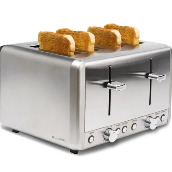 Champions brödrost ger gyllene rostat bröd för familjens lugna morgonstunder. Med 6 ställbara värmenivåer väljer du enkelt den nivå av rostning du önskar. Med en stilren designen i rostfritt stål blir brödrosten en fin detalj i köket. Brödrosten rymmer 4 brödskivor per rostning och har funktioner för upptining samt återuppvärmning.