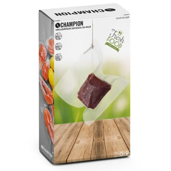 Med Champion vakuumpåsar kan du vakuumförpacka önskat livsmedel på ett säkert och hållbart sätt. Påsarna kan användas i mikrovågsugn samt i sjudande vatten (vid t.ex. Sous Vide-matlagning). Påsarna kan återanvändas och tål att diskas i maskin. CHVF410-50P passar bl.a. till Champion vakuumförpackare CHVF410. Givetvis är Champions vakuumpåsar godkända enligt EU´s Food Contact Materials (1935/2004/EG) samt REACH-förordningen (EG 1907/2006).