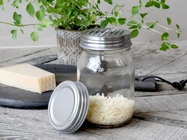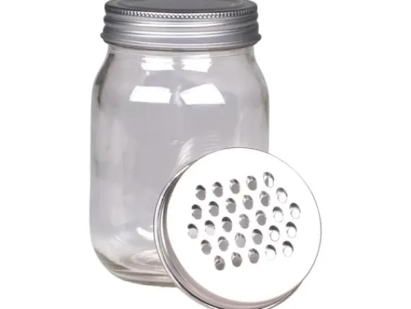 Glasburk med 2 metall lock, ett med rivjärn och ett lock utan hål, bra och smart förvaring när man rivit ost eller permesan tex.