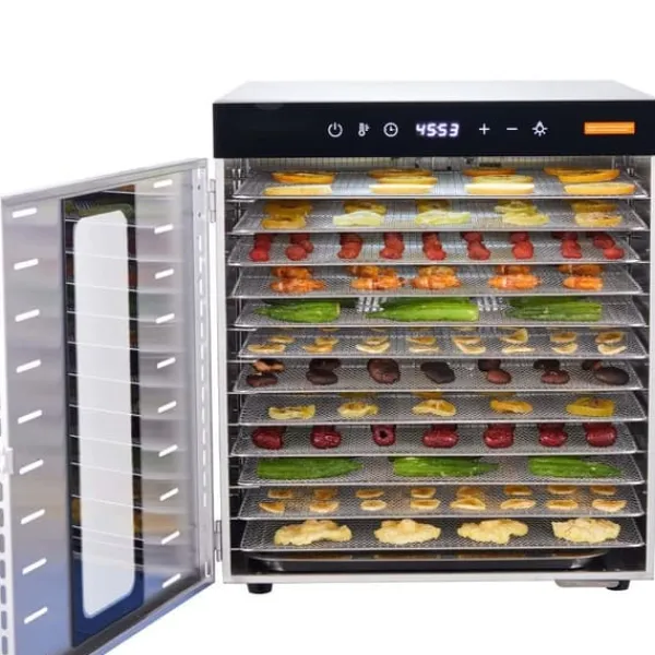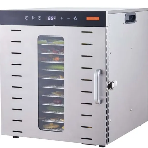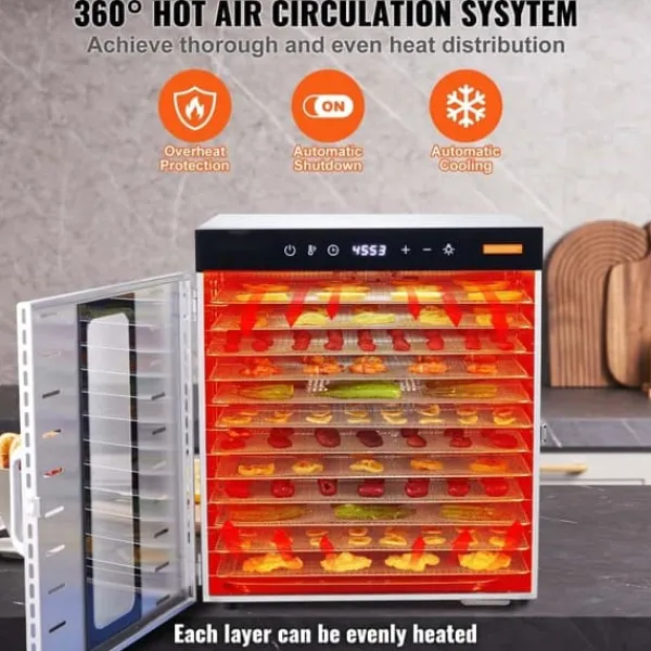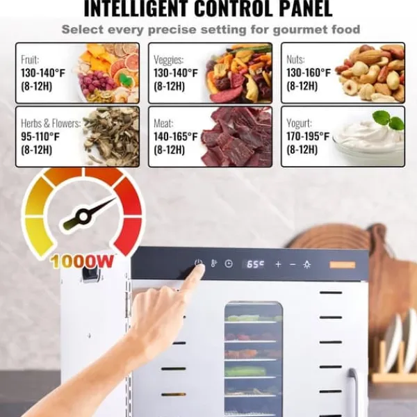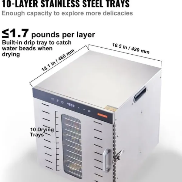 10-lags rustfrit stål skåle: Denne dehydrator er udstyret med ti skåle lavet af fødevaregodkendt rustfrit stål 304, hver med en størrelse på 37,7 x 28,5 cm. Hver skål kan rumme op til 771 g fødevarer, hvilket gør det muligt at tørre forskellige frugter og grøntsager på én gang.