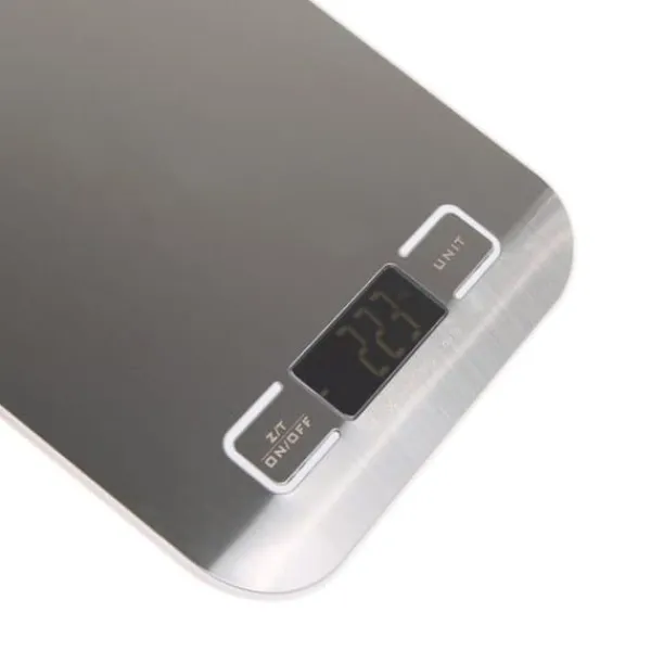 Har du brug for en enkel og smart vægt til dit køkken, hjem eller kontor? Denne digitale køkkenvægt i rustfrit stål har en LCD-skærm, der tydeligt viser vægten i gram, ml, lbs eller oz. Vægten kan måle op til 5 kg og anvendes med 2 AAA-batterier, der medfølger. Vægten har både advarsel ved lavt batteri og automatisk sluk for at sikre, at batterierne varer så længe som muligt, så de er klar, når du har brug for det!