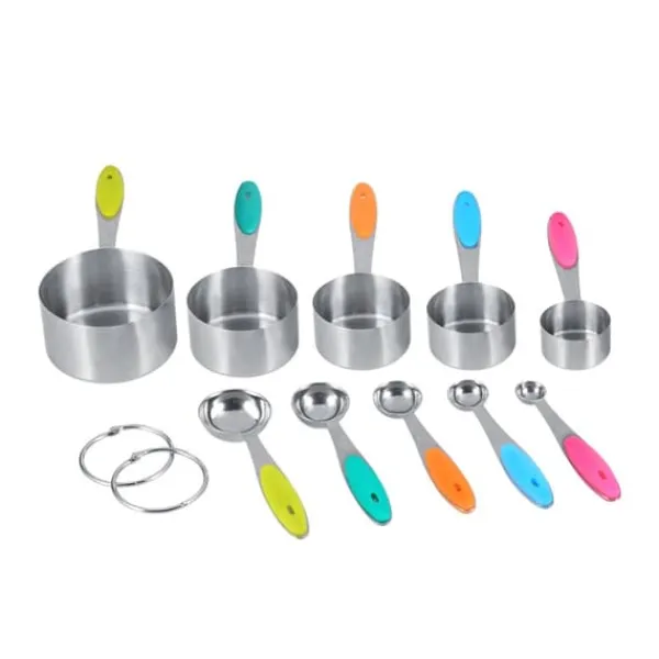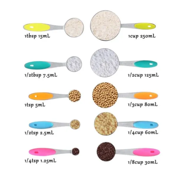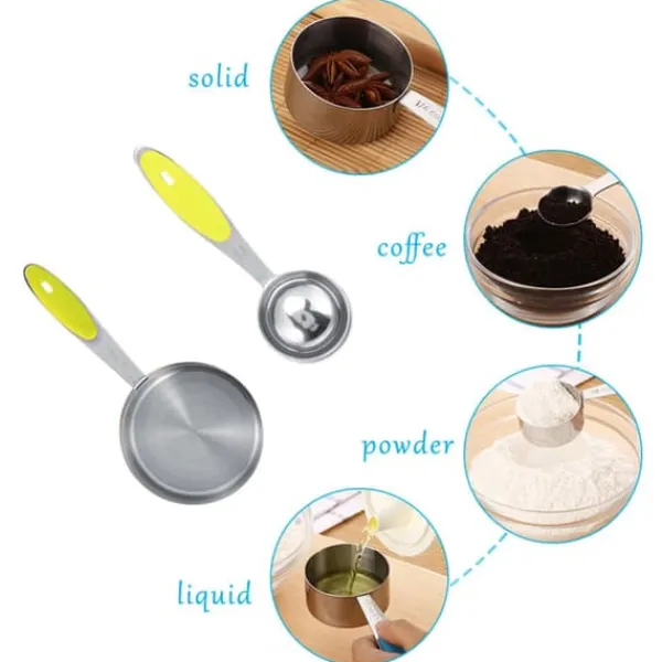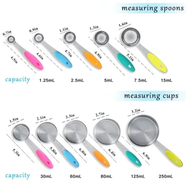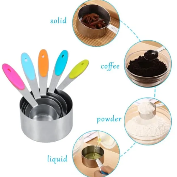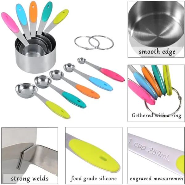 Velkommen til vores butik! Dette målesæt af høj kvalitet indeholder 5 måleskeer og 5 målebægre, fremstillet af førsteklasses satinbørstet 304 rustfrit stål for holdbarhed og en poleret finish. Skeerne har runde hoveder og komfortable silikonehåndtag for præcis og nem brug. Hver del er graveret med både amerikanske og metriske mål, hvilket sikrer klar læsbarhed og langvarige markeringer. Sættet leveres med to runde ringe til praktisk opbevaring, så dit køkken holdes organiseret og du sparer plads. Disse værktøjer er designet med flade baser og vægtede håndtag for at forhindre, at de vælter, og er perfekte til præcis måling af tørre eller flydende ingredienser. De tåler opvaskemaskine for nem rengøring. Dette sæt er en fremragende gave til forskellige lejligheder. Tilfredshed: Vores kunder er vores højeste prioritet. Hvis du oplever problemer med produktet efter modtagelse af varerne, såsom skader eller forkert mængde varer, bedes du kontakte sælgeren med det samme. Vi gør vores bedste for at give dig tilfredsstillende eftersalgsservice.
