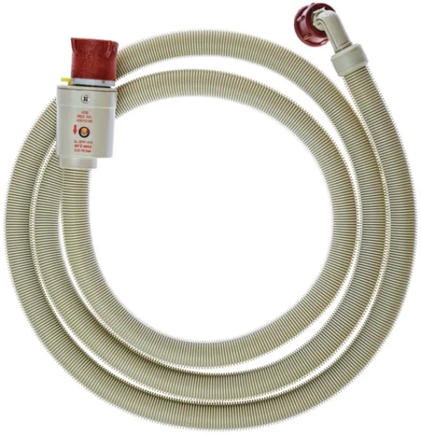 Denne vandslange har en indbygget vandstop for at forhindre oversvømmelse. Hvis mekanismen lækker, stopper vandgennemstrømningen. Et lille vindue bliver rødt, når mekanismen aktiveres, hvilket indikerer, at slangen skal udskiftes.