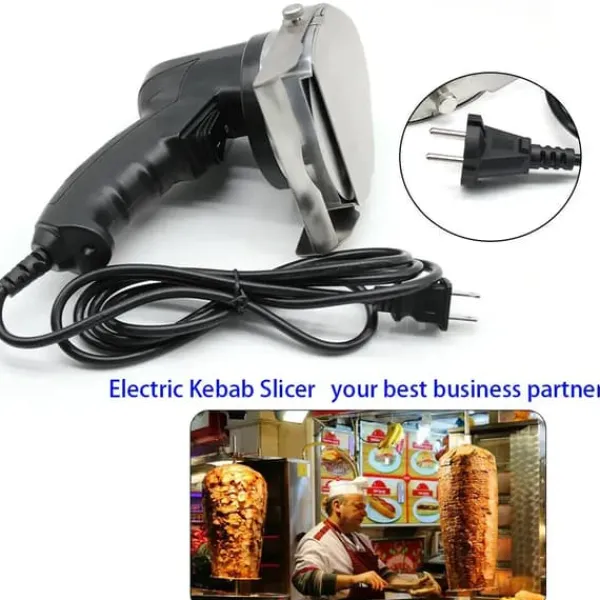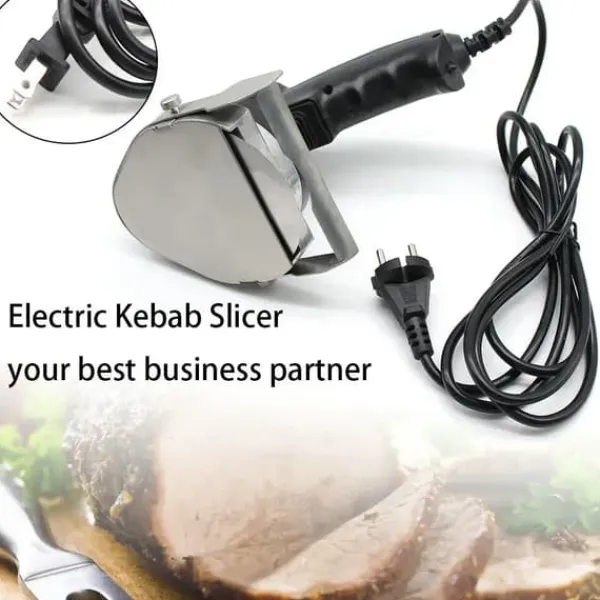 Kompakt elektrisk kebabskærer til præcise, ensartede skiverHåndholdt kebabskærer med ultraskarpt rundt blad (Ø 10 cm) i rustfrit stål, justerbar skivetykkelse 1–8 mm og støjsvag 80 W motor. Perfekt til lam, kylling eller okse – hurtigt, rent og bekvemt med ergonomisk greb og aftageligt, opvaskemaskinesikkert blad.