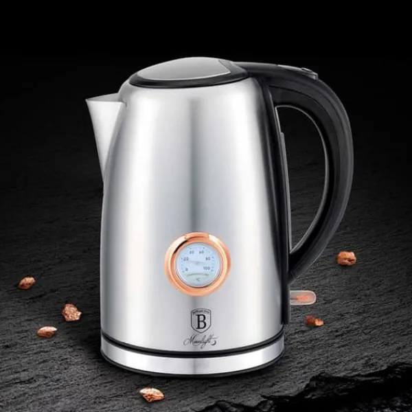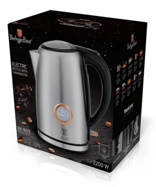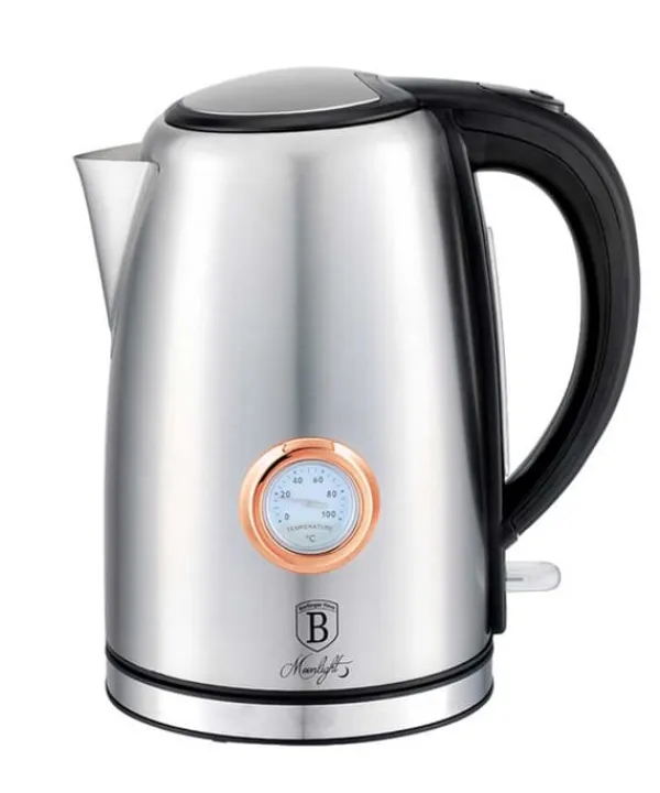 Elegant og moderne elkedel fra Berlinger Haus fra Moonlight Collection-linjen. Det passer perfekt til dette firmas tallerkener og køkkentilbehør. Det indbyggede termometer giver dig mulighed for at kontrollere temperaturen på vandet i kedlen. Designerudseendet er en ubestridelig fordel ved denne model. Kapacitet: 1,7 L Spænding: 220-240 V ~ 50/60 Hz Effekt: 2200 W Materiale: Rustfrit stål/plastik Farve: metallisk Egenskaber: Elegant design Stilfuldt og funktionelt Ergonomisk håndtag Måleskala Filter Funktionelt LED-lys