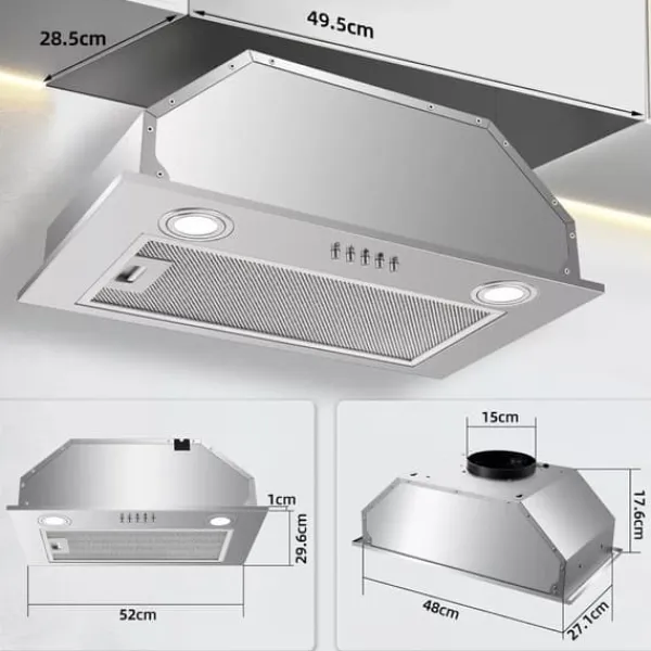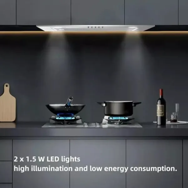 - indbygget led-belysning: udstyret med to klare 1,5w led-lamper, giver denne udsugning rigelig belysning af dit madlavningsområde, samtidig med at den er energieffektiv og reducerer blænding.