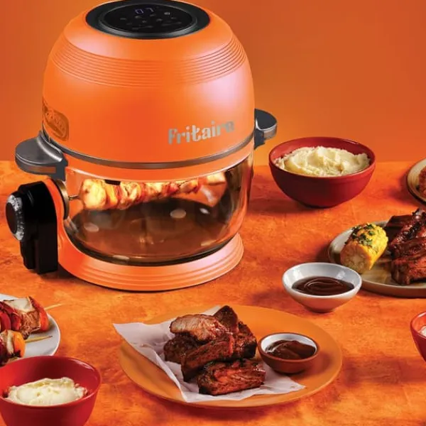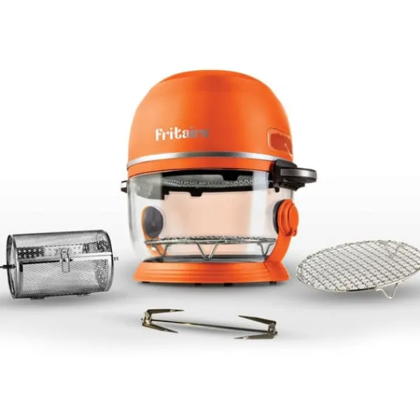 Fritaire Air Fryer bruges til stegning, bagning, opvarmning og tørring! Med gennemsigtig 4,8 L glasskål og 6 madlavningsfunktioner. Dette inkluderer: 1 Fritaire Air Fryer, tilbehør – kurv, rotisseri/spid, greb, rotisseriemotor, rist, manual på forskellige sprog.