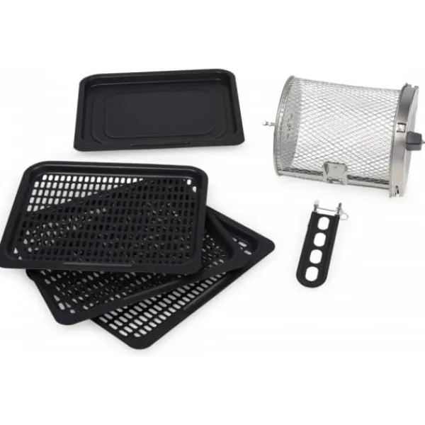 Princess 183032 Aerofryer Oven er både en airfryer og en kompakt varmluftsovn i en sikker og brugervenlig pakke! Den luksuriøse kombination af apparater gør det muligt for dig at grille, bage, stege og frityrstege. Enhedens roterende kurv garanterer de sprødeste resultater nogensinde. Den cirkulerende luft i Princess Aerofryer-ovnen eliminerer behovet for olie ved tilberedning af kartofler, kød, fisk og grøntsager. Ovnen kombinerer varm cirkulerende luft ved den perfekte temperatur, og teknologien for højhastigheds luftstrøm garanterer en sprød overflade. Udover ni forprogrammerede indstillinger kan temperaturen justeres manuelt mellem 80 og 200 °C for et perfekt resultat. Takket være de tre medfølgende ovnracks kan ovnen rumme en stor mængde snacks på samme tid. En digital touchskærm gør det meget nemt at vælge den rigtige temperatur eller program, mens timerfunktionen og overophedningsbeskyttelsen sikrer sikker drift. Det specielt udviklede håndtag på den roterende kurv kan bruges til at fjerne kurven og tømme den over pladen uden at røre ved varme overflader. Med en forprogrammeret indstilling kan du vælge den rigtige temperatur og bage tid ved tryk på en knap, og ovnen har ni forprogrammerede indstillinger til forskellige typer mad. Sund og sikker Princess 183032 Aerofryer Oven airfryer!