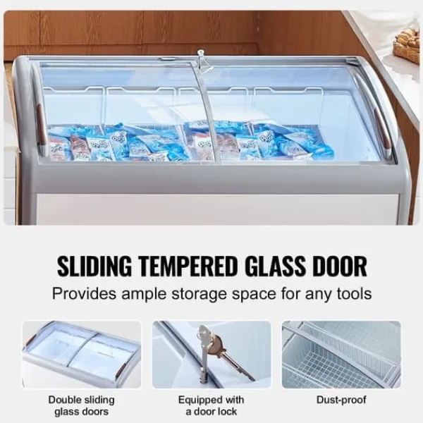 Hver mobil kummefryser i glas er designet med glasdøre, der kan åbnes i begge retninger, hvilket gør det bekvemt for dig at få adgang til isen. Dørene er udstyret med låse for ekstra sikkerhed.