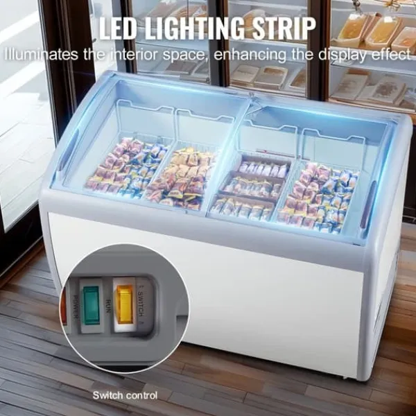 Denne kommercielle ismontre har 4 is-udstillingskurve og LED-strimmelbelysning og en højsynlighedsdør i hærdet glas for at forbedre displayeffekten. Kunderne kan nemt vælge deres yndlingsis.