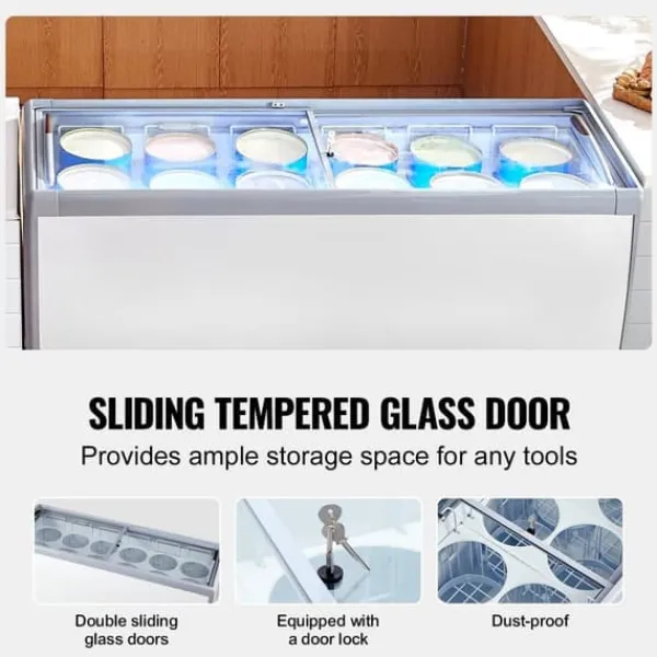 Hver mobil kummefryser i glas er designet med glasdøre, der kan åbnes i begge retninger, hvilket gør det bekvemt for dig at få adgang til isen. Dørene er udstyret med låse for ekstra sikkerhed.