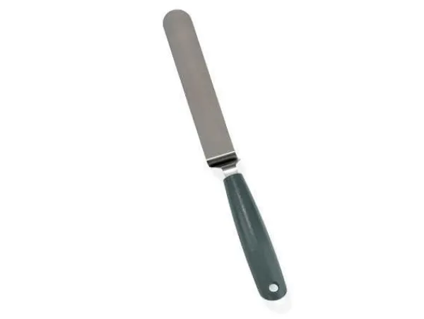Paletten har huvud av stål och grepp av PP. Tjockleken och böjen på paletten gör den lätt att använda överallt där man vill föra in den under något ämne.