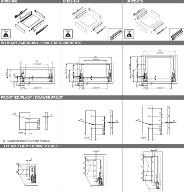 BOX2 er en skuffe lavet af materialer af høj kvalitet, der fungerer stille og problemfrit. Dens høje lasteevne (op til 40 kg) muliggør stressfri opbevaring af alle slags genstande. Skuffen er meget fejlfri med 60.000 åbne- og lukkecyklusser, hvilket betyder, at den kan bruges uden fejl i op til 11 år.Skuffen har fuldt udtræk og soft-close-funktion. Den fås i tre forskellige højder og adskillige længder.