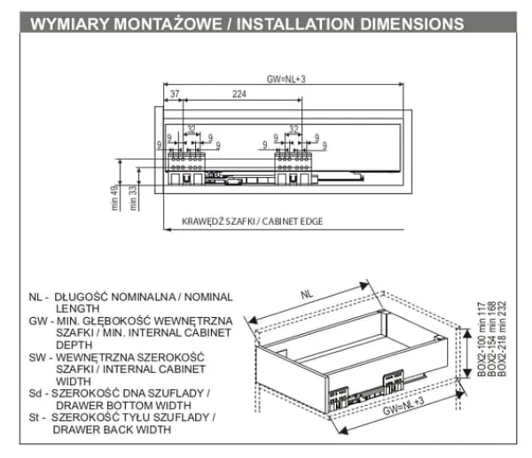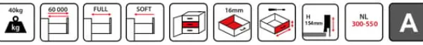 BOX2 er en skuffe lavet af materialer af høj kvalitet, der fungerer stille og problemfrit. Dens høje lasteevne (op til 40 kg) muliggør stressfri opbevaring af alle slags genstande. Skuffen er meget fejlfri med 60.000 åbne- og lukkecyklusser, hvilket betyder, at den kan bruges uden fejl i op til 11 år.Skuffen har fuldt udtræk og soft-close-funktion. Den fås i tre forskellige højder og adskillige længder.