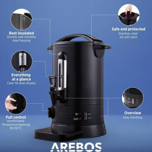 Forsød den kolde årstid med den højkvalitets 950 W gløggmaskine fra AREBOS. Den professionelle varmtvandsdispenser tilbyder konstant opvarmning og praktisk tilberedning af varme drikke såsom te, kaffe, gløgg og øl. Apparatet er velegnet til både catering og hjemmebrug.