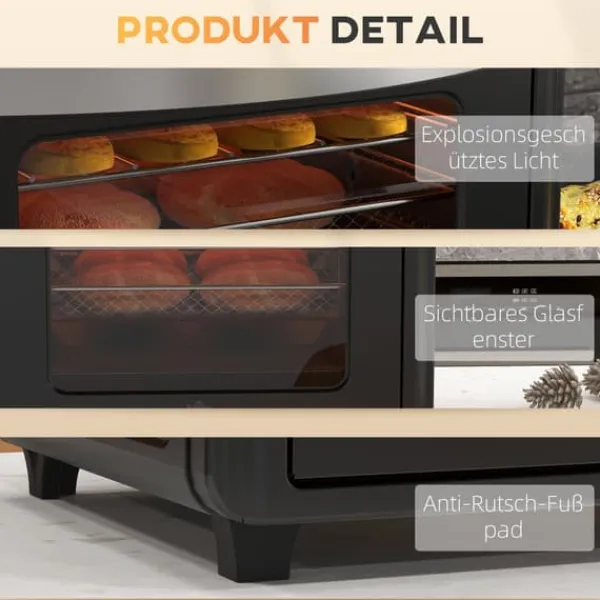 Alsidige tilberedningsfunktioner: Med en justerbar temperatur fra 90-230 °C og en timer på op til 60 minutter er dette apparat nemt at bruge. Syv forskellige funktioner, herunder genopvarmning, stegning, stegning, bagning og friturestegning, giver kulinarisk fleksibilitet.