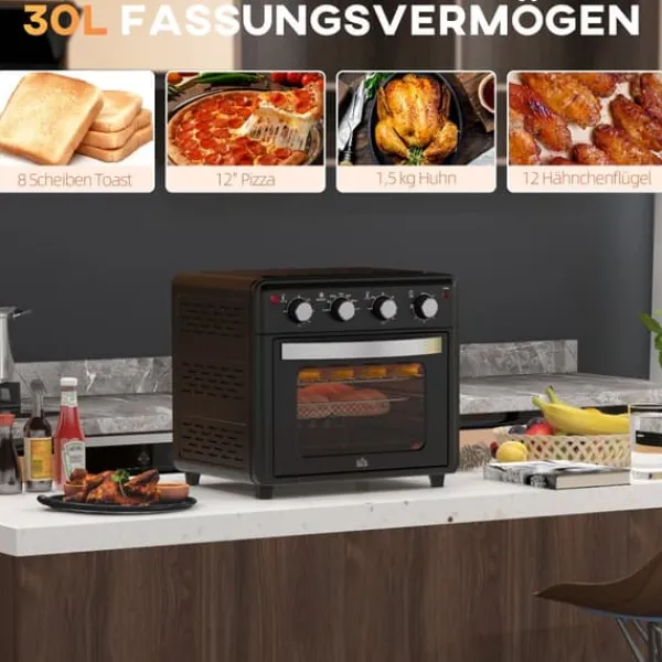 Generøs kapacitet: Med en kapacitet på 30 liter har miniovnen plads til op til 8 skiver toast, en 30 cm pizza, 1,5 kg kylling eller 12 kyllingevinger. Det 4-lags design giver mulighed for tilberedning af forskellige fødevarer på samme tid.