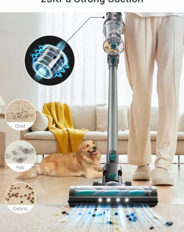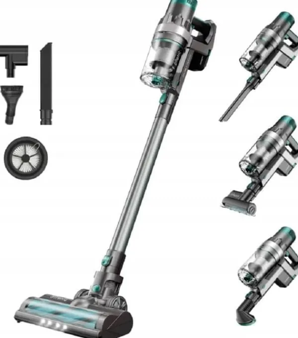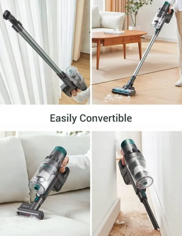 Denne håndholdte støvsuger 4-i-1 kan ikke kun nemt omdannes til en opretstående støvsuger, men leveres også med en børstetilbehør. en rullebørste, en rundbørste, et langt fugemundstykke og et lille motoriseret mundstykke. De vil i høj grad hjælpe dig med at støvsuge en række forskellige overflader, genstande og møbler, herunder hårde gulve, tæpper, flisegulve, marmorgulve, laminat, vinyl, linoleumssenge, sofaer og endda bilinteriør.