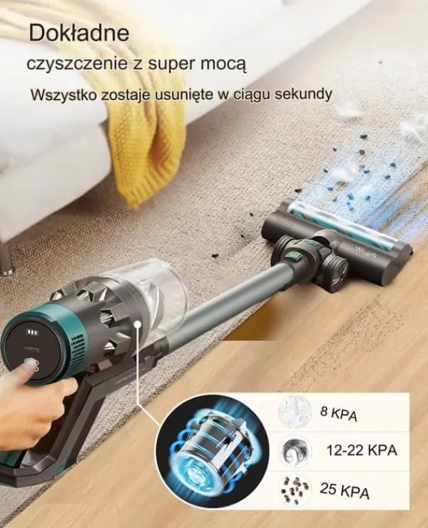 - Avanceret børsteløs motor giver maksimal sugekraft på 25.000 Pa, som muliggør nem og jævn sugning af alt støv, snavs og snavs fra overflader.