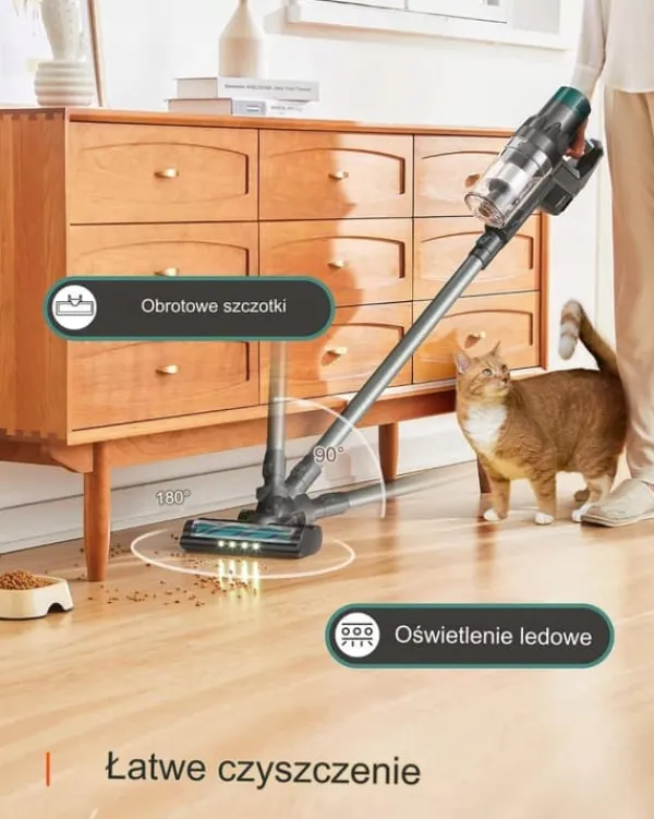 Støvsug hurtigt tæpper og gulve takket være LED-belyst tilbehør sugedysen, der opsamler støv fra alle sider. Børsten roterer også.