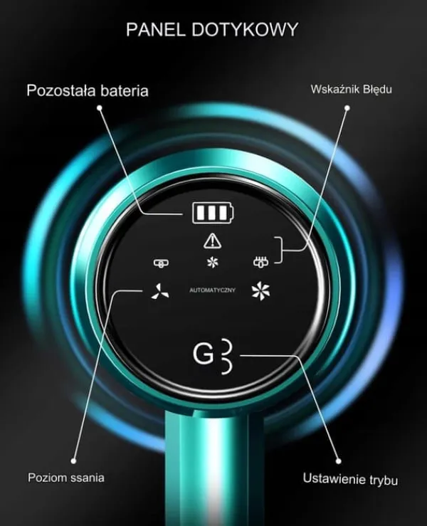 Håndtaget er udstyret med et berøringsskærmdisplay, som inkluderer en batteriopladningsindikator og muligheden for at skifte mellem tilstande. Derudover kan du se eventuelle fejl og meddelelser, der vises på skærmen, uden at afbryde dit arbejde. Du kan også mindske eller øge sugekraften, mens apparatet er i drift.