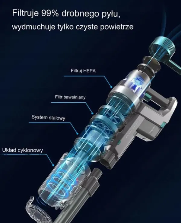 Anvender cyklonteknologi kombineret med et HEPA-filter med høj densitet, 4-trins, fuldt forseglet cyklonfiltreringssystem, der opfanger over 99,99% af støv, pollen, kæledyrshår og ekskrementer, hvilket giver frisk, ren luft for at forhindre sekundær luftforurening og give en fremragende rengøringsoplevelse.