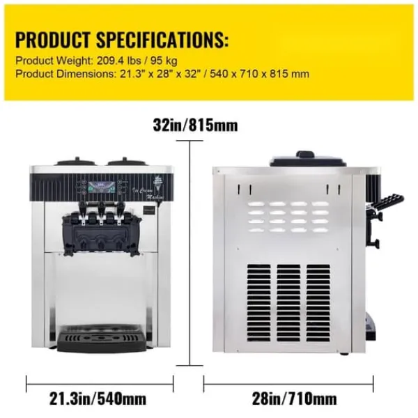 Denne kommercielle ismaskine er udstyret med to 1,6 Gal (6 L) traktorer, der begge er lavet af fødevarevenligt 304 rustfrit stål. Maskinen kan producere op til 5,3-7,4 Gal (20-28 L) is pr. time, hvilket dækker det daglige behov i både husholdninger og erhvervslivet.