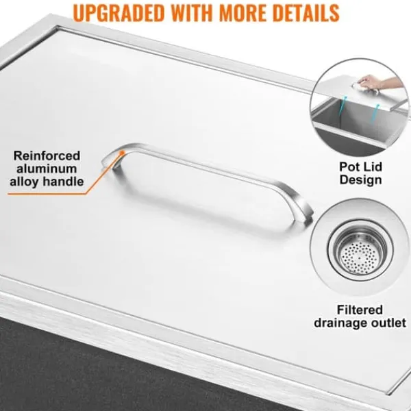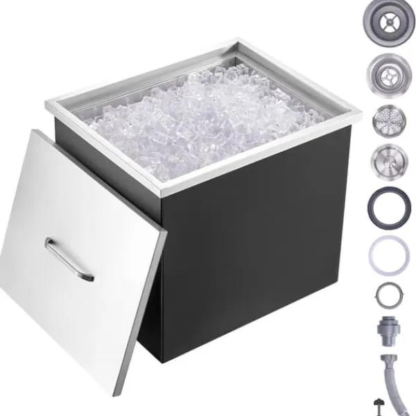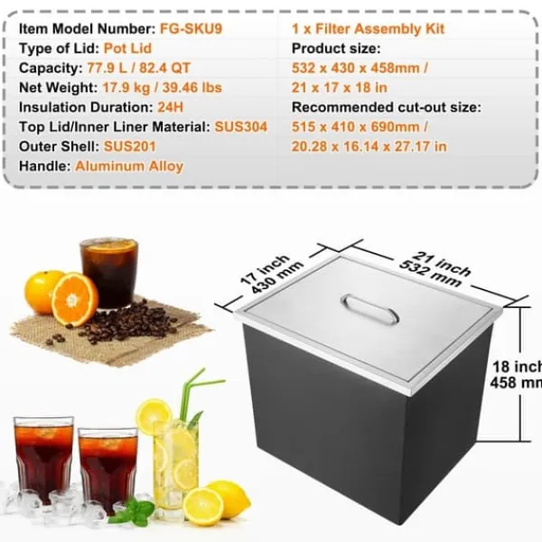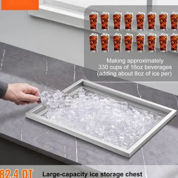 Stort rumfang: Denne Drop-in isbeholder har et imponerende rumfang på ca. 82,4 qt (77,9 L), hvilket gør det muligt at opbevare en stor mængde is. Efter fyldning kan der laves ca. 330 kopper med 16 oz drikkevarer. Ideel til at opbevare is eller nedkøle forskellige drikkevarer til fester og samlinger.