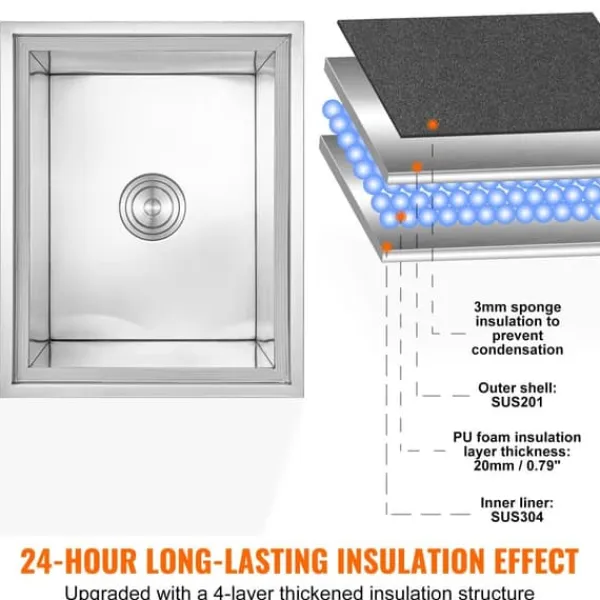 Madvenlige materialer: Hele isbeholderen er lavet af rustfrit stål (SUS304 indvendigt og SUS201 udvendigt), hvilket sikrer lang holdbarhed og rustbeskyttelse. Det fuldsvetsede indre reducerer betydeligt risikoen for lækager, så du kan have ro i sindet, mens du opbevarer is og drikkevarer.