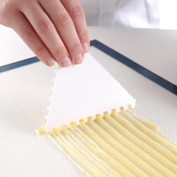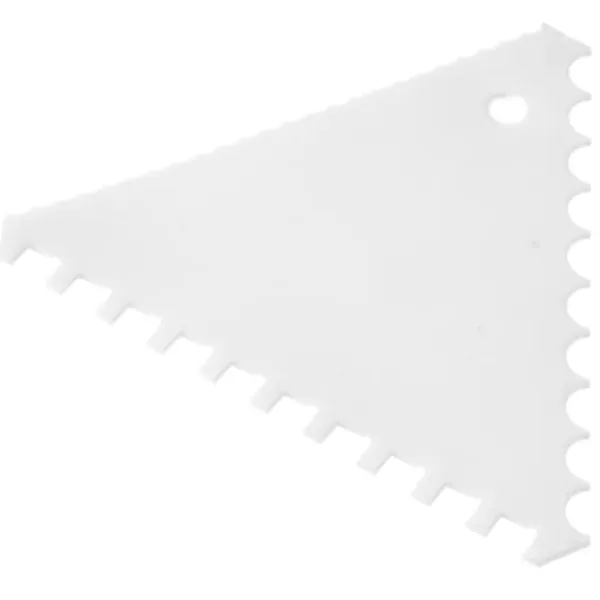 Producentens navn: HENDI 554203 Den trekantede konfektureskraber med tænder fra Hendi er et værktøj skabt til kreative bagere og konditorer. Det giver dig mulighed for bekvemt at forme, dele og dekorere bagværk, hvilket gør det meget nemmere at give dem et unikt udseende. Egenskaber og funktioner: – lavet af polypropylen, – trekantet form med takkede sider, – tåler opvaskemaskine, – 6 stykker pakket i en blisterpakning, – dimensioner (L x S): 110 x 110 mm. Sættet indeholder: – konditorskraber, trekantet, takket kam, bred mellemrum (6 stk.)