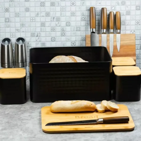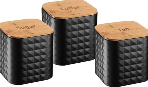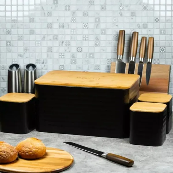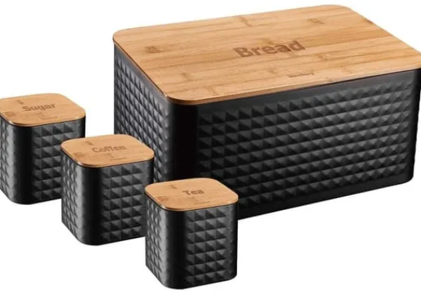 Brødkasse i stål med bambusbræt og et sæt KLAUSBERG køkkenbeholdere i sortlakeret rustfrit stål. Topdæksel lavet af bambustræ. Kan bruges som skærebræt. Designet til opbevaring af alle typer brød. Attraktivt, moderne design. Lavet af økologiske materialer. Emballage: farverigt pap. Sæt med 3 beholdere med bambus låg til opbevaring af løse produkter. Indskrifterne Sugar, Coffee, Tea er præget på omslagene. Låg udstyret med silikoneforseglinger for at sikre hermeticitet af opbevarede produkter. Farve: sort/lys træ. Mål på brødkasse: 23 x 35 x 18,5 cm (LxBxD) Beholdermål: 11,5 x 11,5 x 12,3 cm