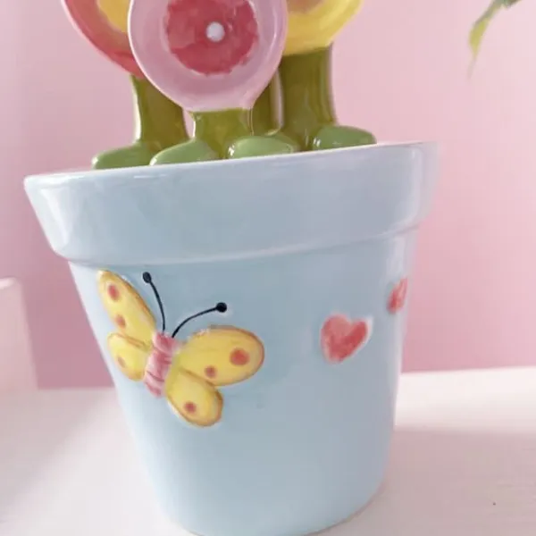 Velkommen til vores butik! Dette yndige sæt med sommerfugleskeer har et charmerende blomsterdesign i keramik, der tilføjer både praktisk anvendelighed og et strejf af vitalitet til dit køkken. Disse måleskeer er lavet af høj kvalitet, tyk og holdbar keramik og er farveægte, nemme at rengøre og tåler opvaskemaskine. Sættet indeholder fire graduerede skeer: 1 spiseske, 1 teske, 1/2 teske og 1/4 teske, hvilket gør dem perfekte til at måle både våde og tørre ingredienser som mel, sukker, salt, mælkepulver, krydderier, te og kaffe. Hver ske er designet til at ligne en lille urtepotte, hvilket giver mulighed for praktisk og pæn opbevaring, samtidig med at det sparer bordplads. Med en komfortabel og brugervenlig form er disse unikke bageredskaber ikke kun funktionelle, men er også en sød gave til venner. Skeerne måler cirka 14 cm i længden og fås i en flerfarvet finish. Du modtager 1 sæt måleskeer. Tilfredshed: Vores kunder er vores højeste prioritet. Hvis du oplever problemer med produktet efter modtagelse af varerne, såsom skader eller forkert mængde varer, bedes du kontakte sælgeren med det samme. Vi gør vores bedste for at give dig tilfredsstillende eftersalgsservice.